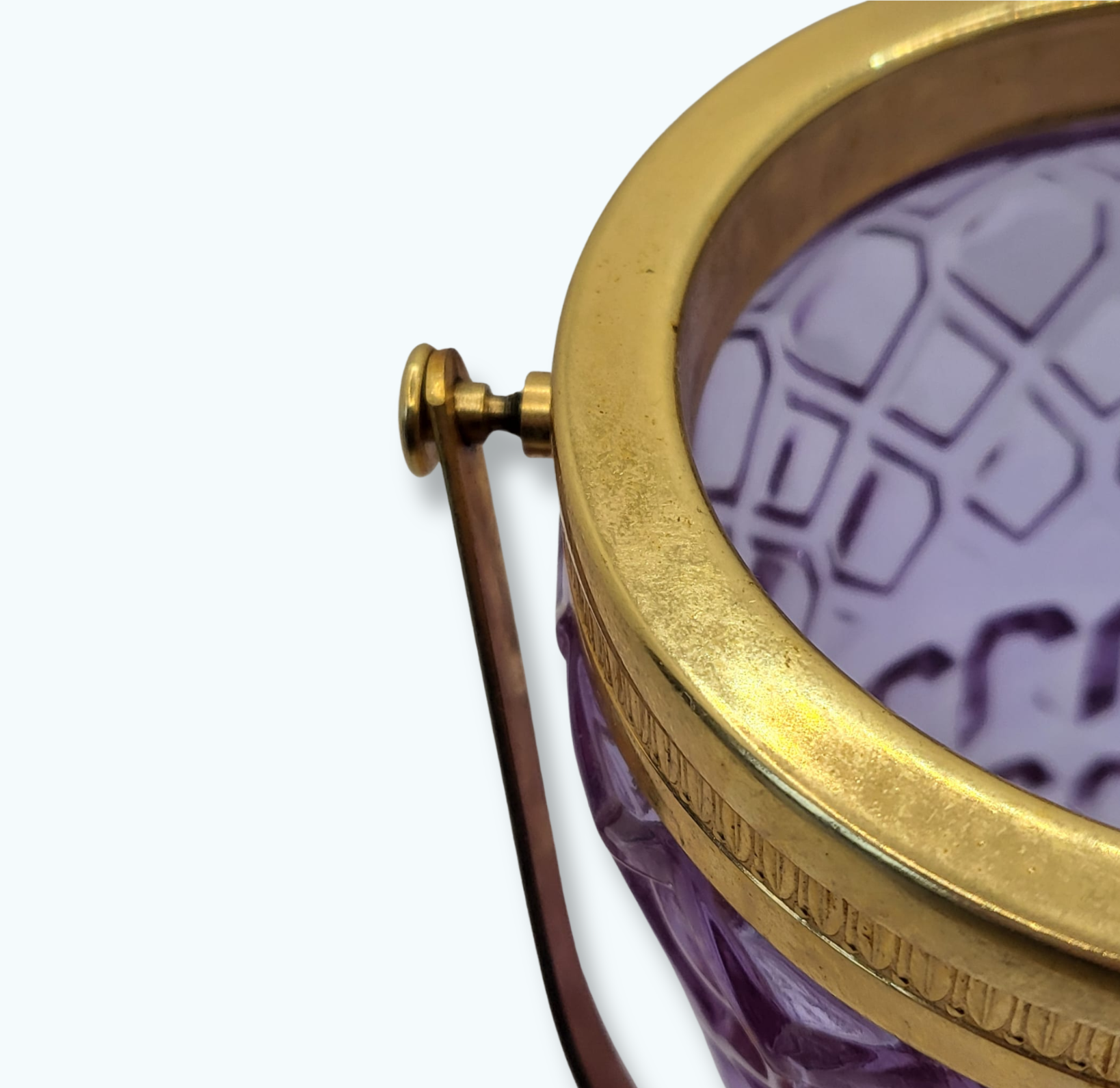 Apportez une note rétro et élégante à vos apéritifs avec ce magnifique bac à glaçons en verre violet, rehaussé d’une monture et d’une anse en métal doré. Sa teinte originale et son design facetté captent la lumière et en font une pièce à la fois pratique et décorative.