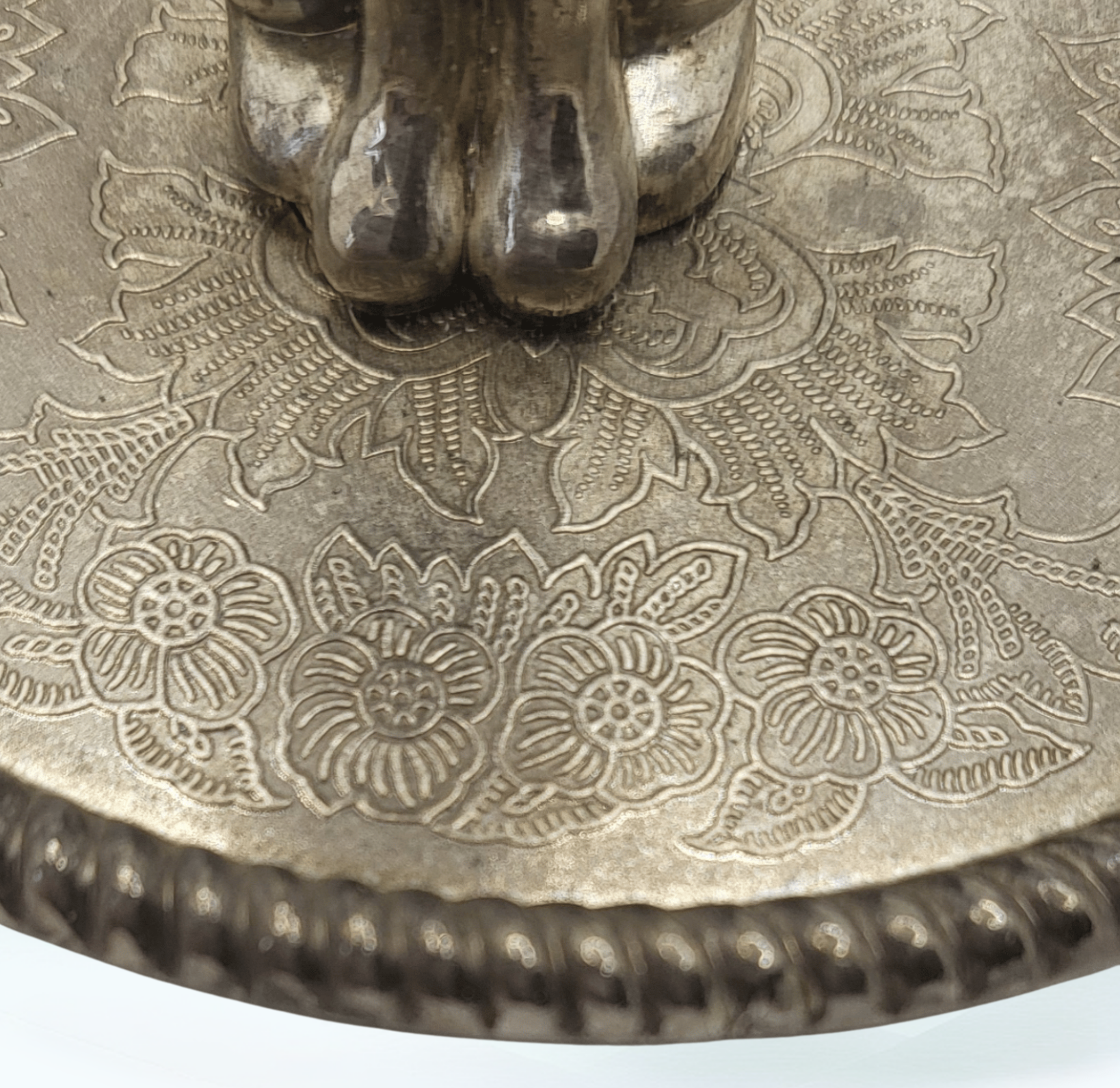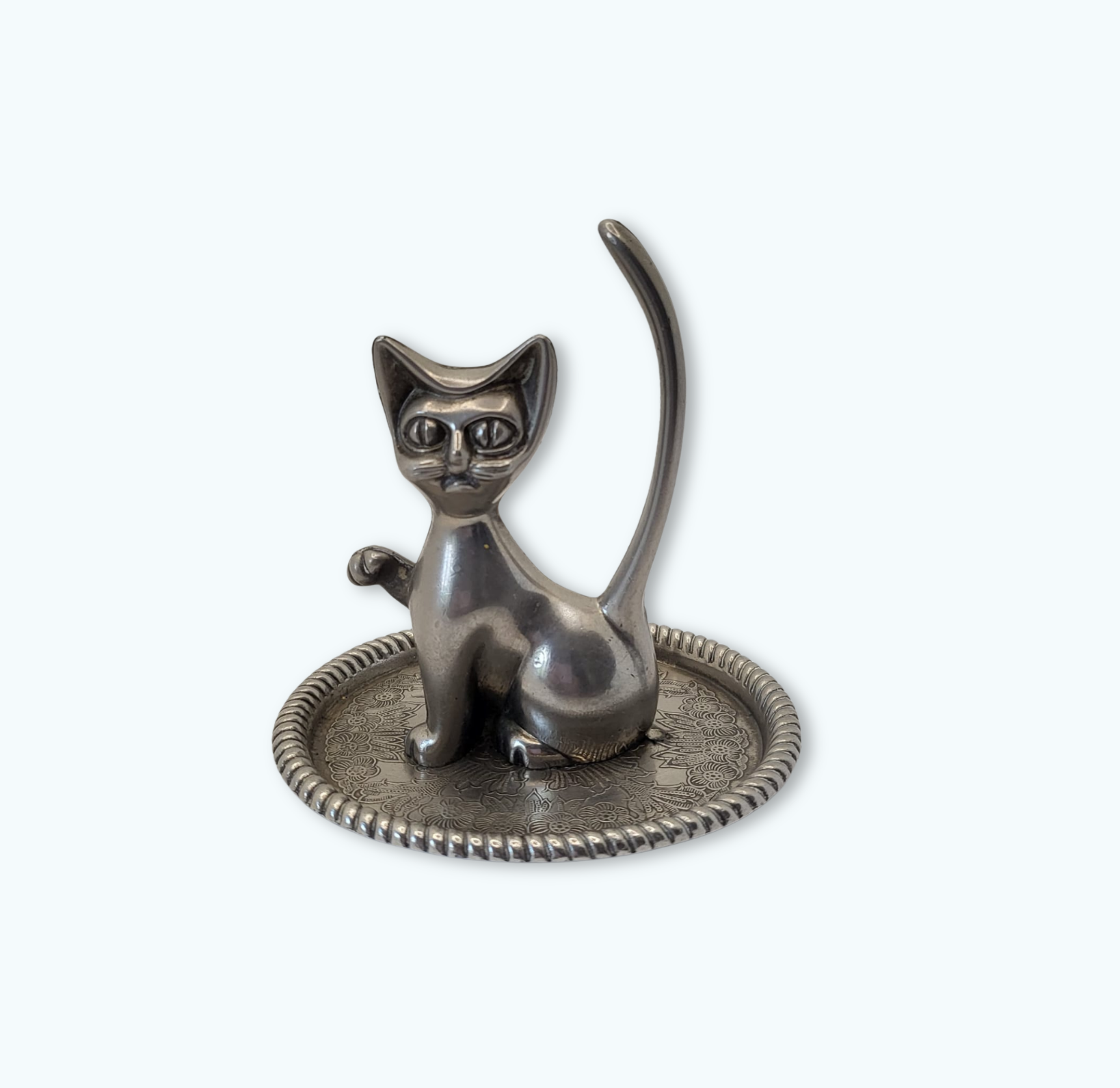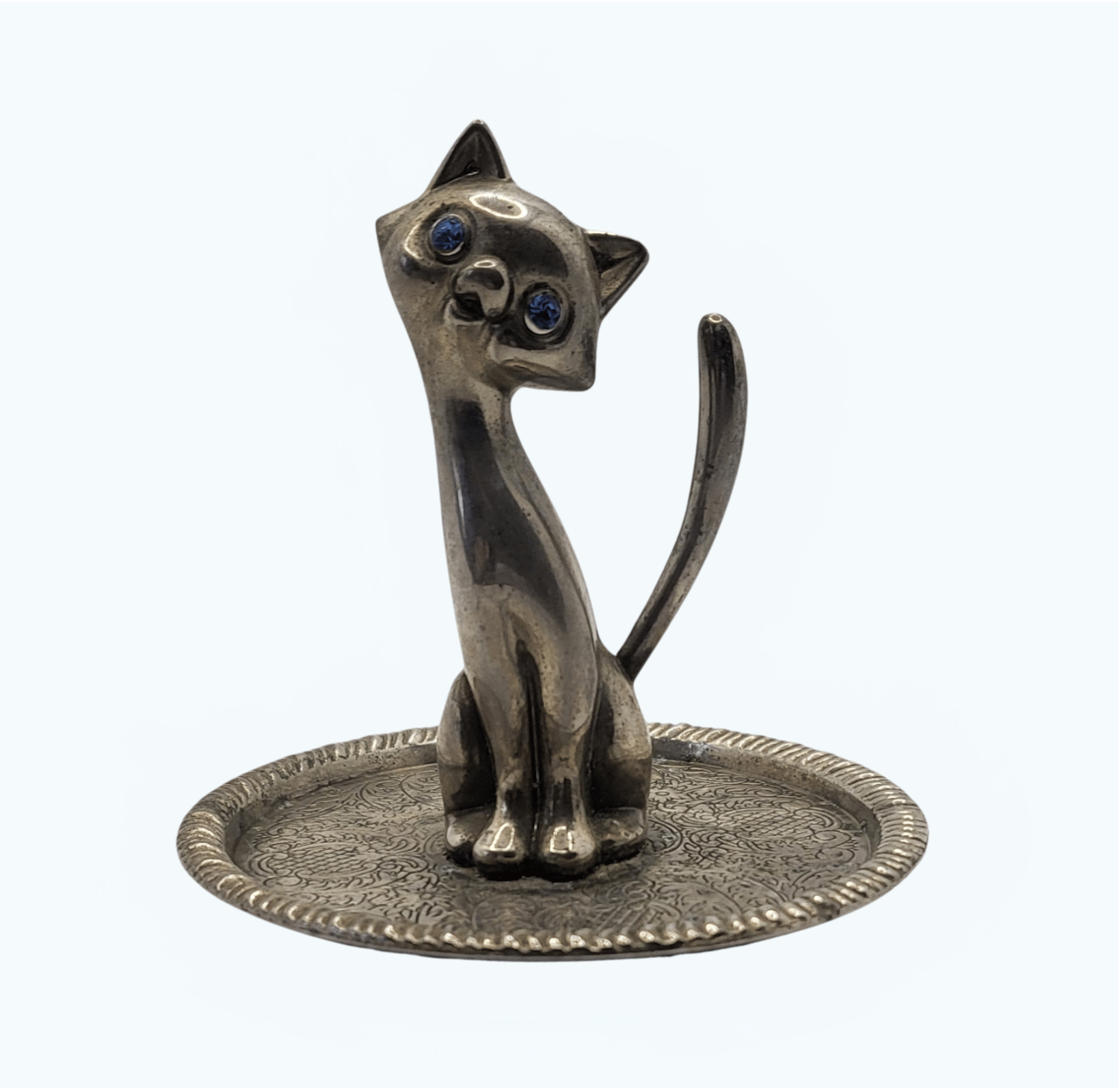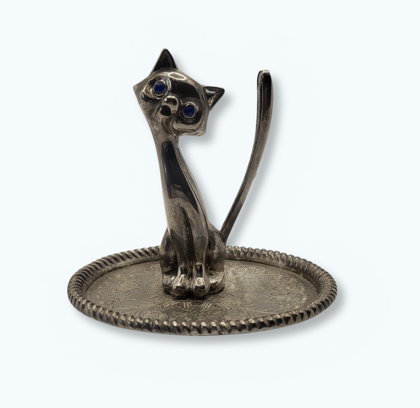 Porte-bijoux ancien en métal argenté – Chat vintage Movitex