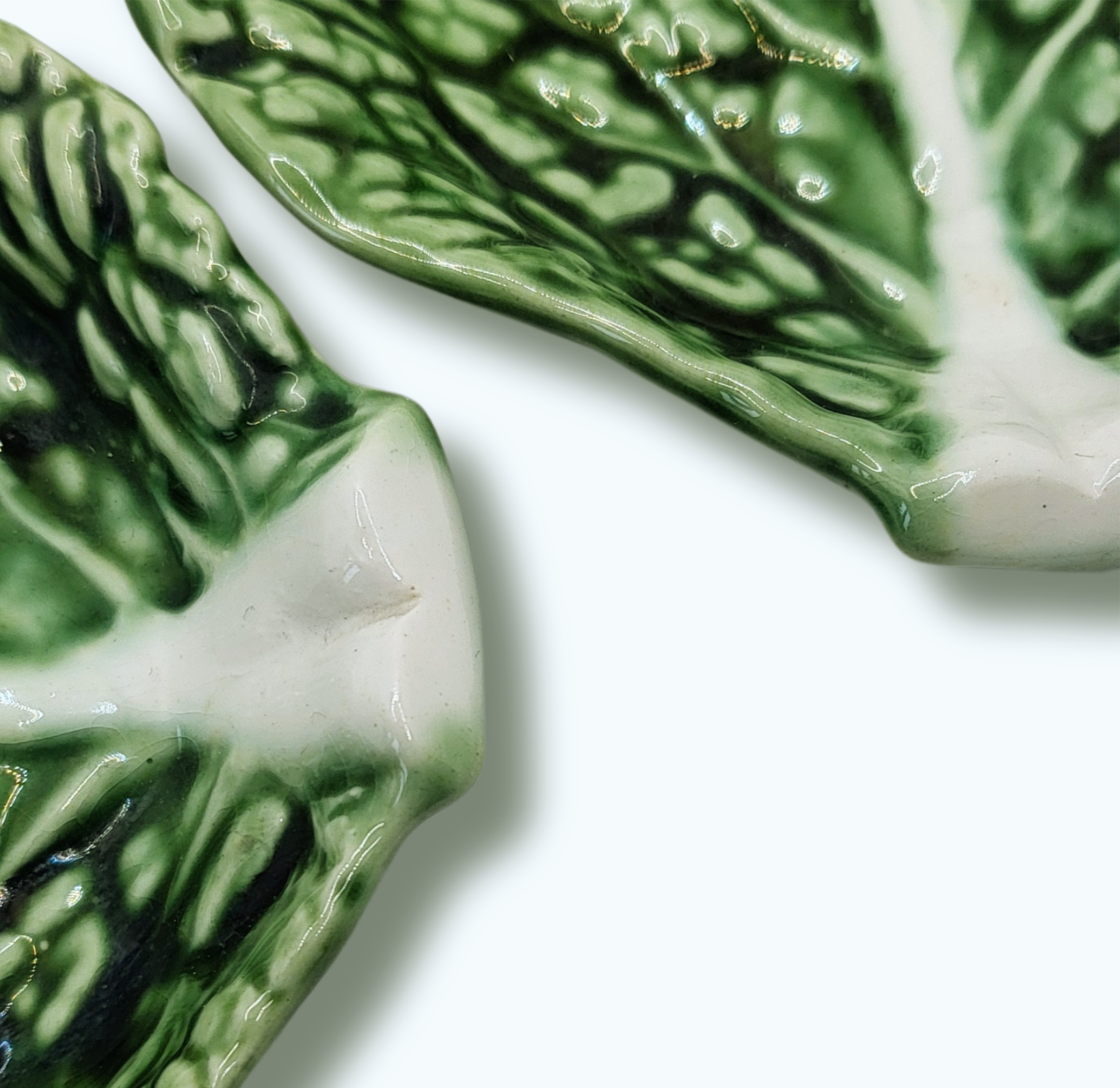 Deux adorables coupelles anciennes en forme de feuilles de chou, prêtes à apporter une touche vintage et nature à votre table ou à votre décoration. En barbotine verte, ces pièces emblématiques de la céramique Secla, produites au Portugal dans les années 60, sont à la fois décoratives et fonctionnelles.
